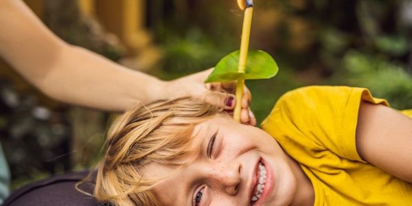 An ear candle is a lighted, hollow candle made from fabric which draws out excessive earwax and any minor impurities.